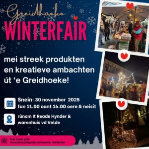 Greidhoeke Winterfair 𝘇𝗼𝗻𝗱𝗮𝗴 𝟯𝟬 𝗻𝗼𝘃𝗲𝗺𝗯𝗲𝗿 𝗶𝗻 𝗪𝗼𝗺𝗺𝗲𝗹𝘀 Op 30 November barst het op ‘it Noard’ en in de ‘binnentûn’ van Grandcafé it Reade Hynder van de lokale kerstperikelen. Met lokale standhouders, livemuziek, vuurkorven en lekker eten belooft de Winterfair in Wommels een gezellig ‘barren’ te worden. ‘Streekprodukten & kreatieve ambachten út ‘e Greidhoeke!’ Een verrassende […]
