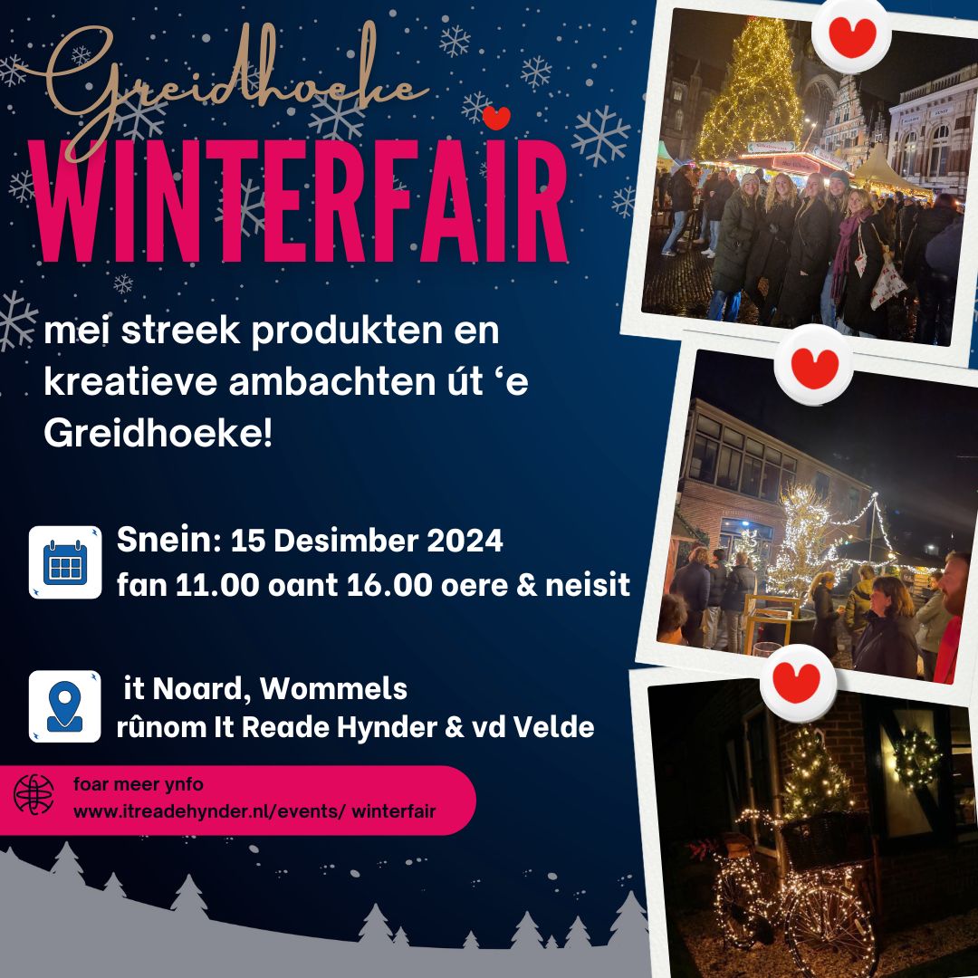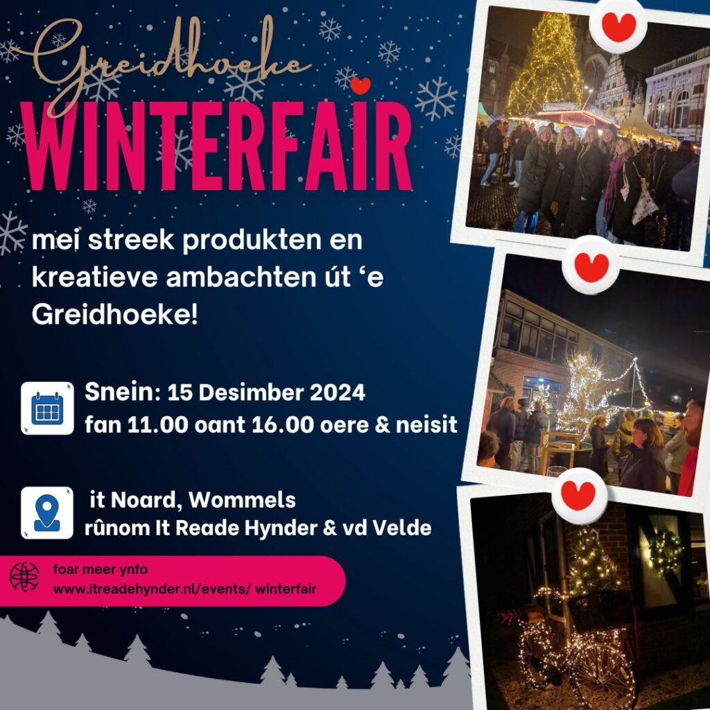 15 December: WinterfairFan 11.00 oant 16.00 oere met streek producten en creatieve ambachten uit de Greidhoeke! met een leuke variatie aan Standhouders Rondom it Noard yn Wommels volop gezelligheid op it plein rondom It Reade Hynder en Van der Velde. Live Muziek van: reserveer nu vor het diner 15 december Schakel JavaScript in je browser in om dit formulier in te vullen.Naam *VoornaamAchternaamE-mail *Reactie of berichtVerstuur Ben je actief in de Greidhoek? meld je hiernaast aan als standhouder! Heerlijk eten en DrinkenGluhweinWarme Chocolademelk met slagroom ——— na Afloop live muziek Proef de sfeer